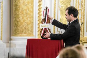 • Muzike ni proponas fragmenton de la originala E-kanzono „Per fido” kiun komponis, la tekston verkis kaj kantas Simmon Keith Barney. La reta foto ĉe nia programinformo prezentas elstaran polan violoniston, Janusz Wawrowski kun unusola pola Stradivarius-violono dum la solenaĵo de nomatribuo „Polonia”.